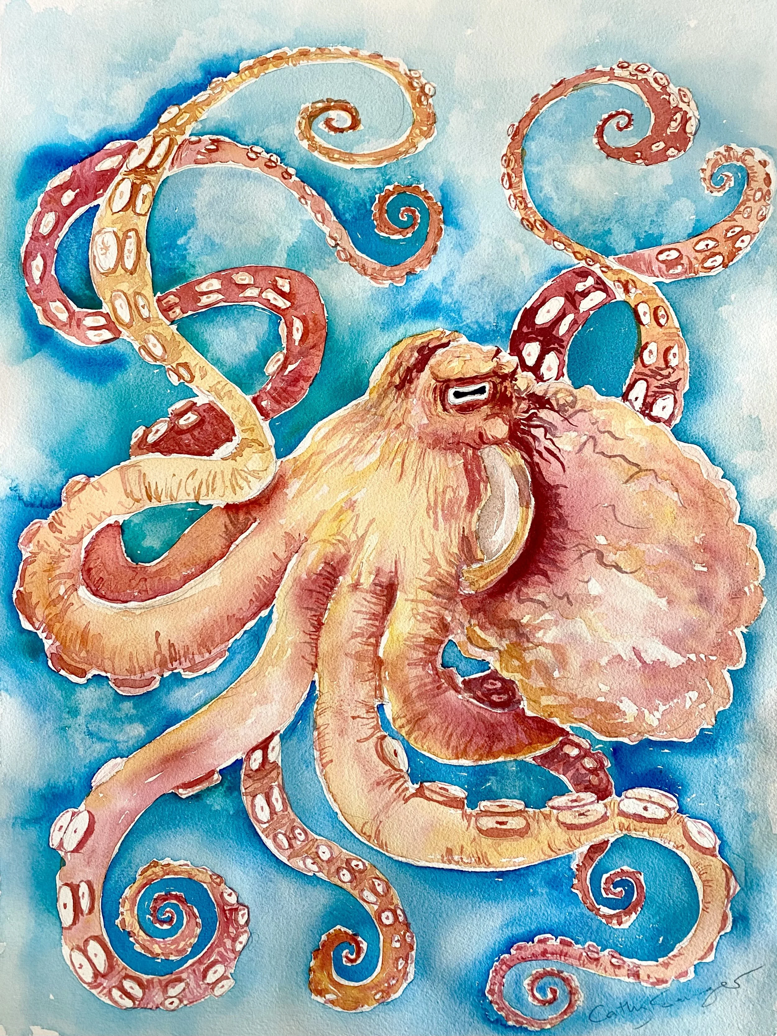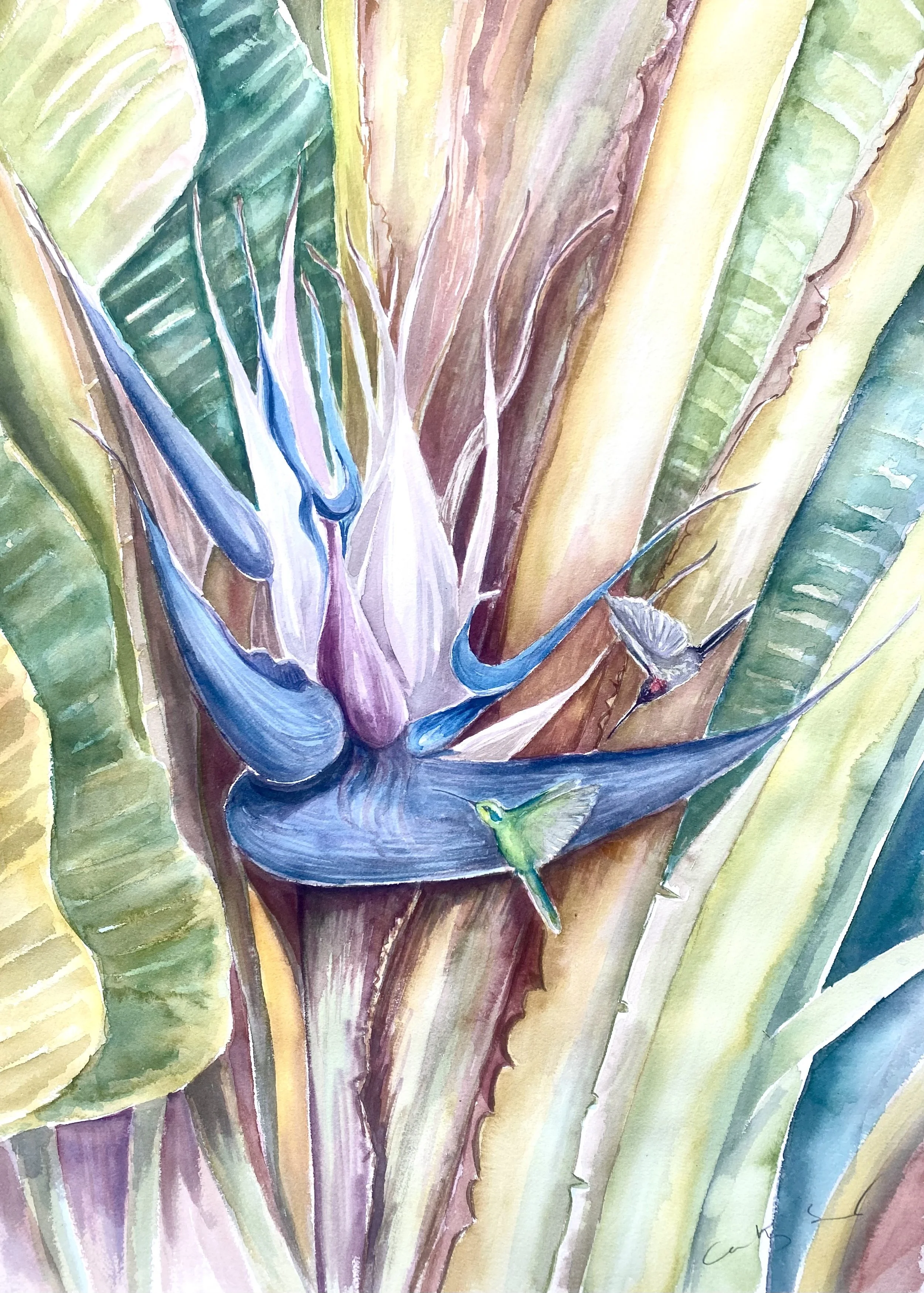 Now available are beautiful vibrant hummingbird botanical and Octopus Ocean watercolor originals and prints (as seen at the Coronado Flower Show 2026).